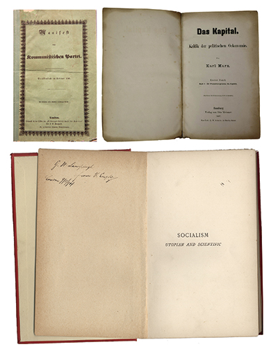 左上圖為1848年《共產(chǎn)黨宣言》德文第一版。右上圖為1867年《資本論》德文第1卷第一版。下圖為恩格斯的題字贈書《社會主義從空想到科學的發(fā)展》,1892年英文版。 中央黨史和文獻研究院供圖